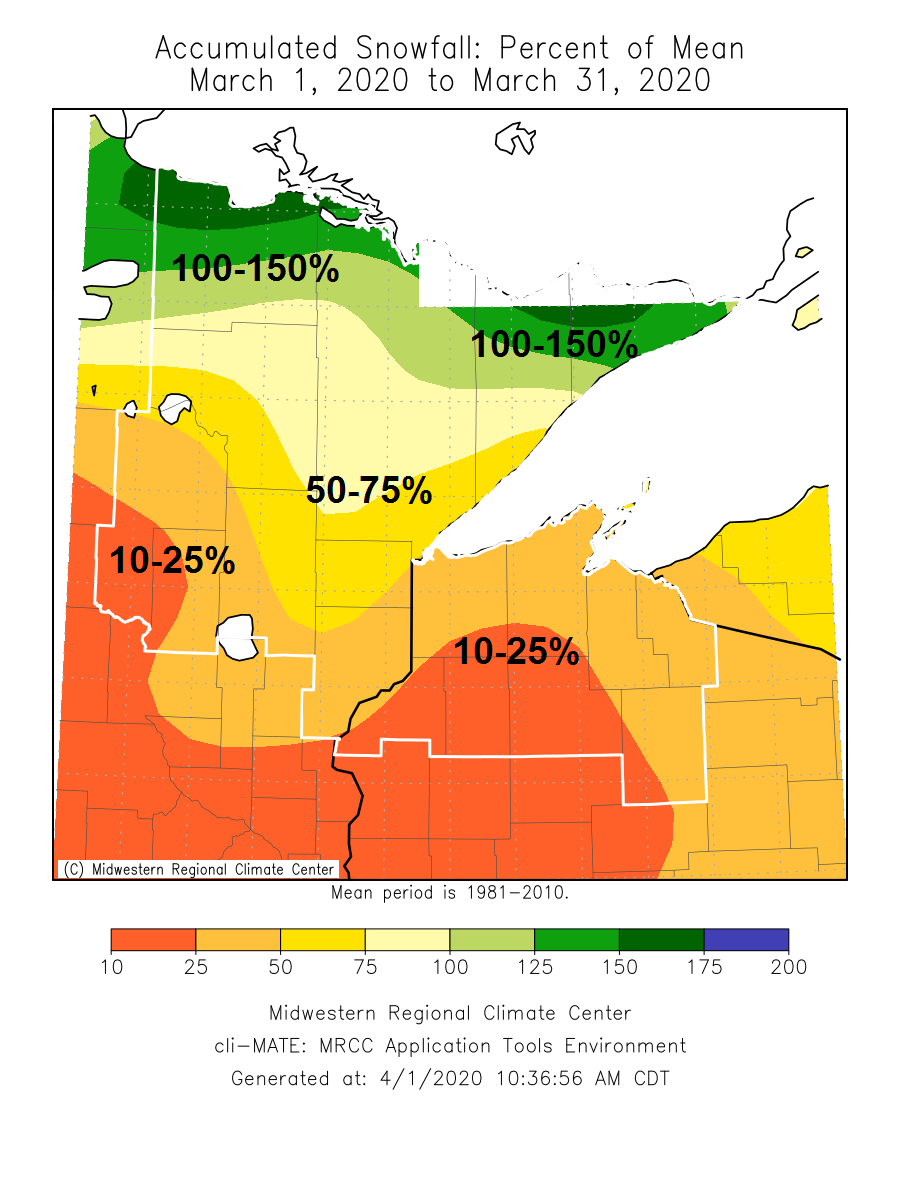 Total snowfall, percent of mean for March 2020
