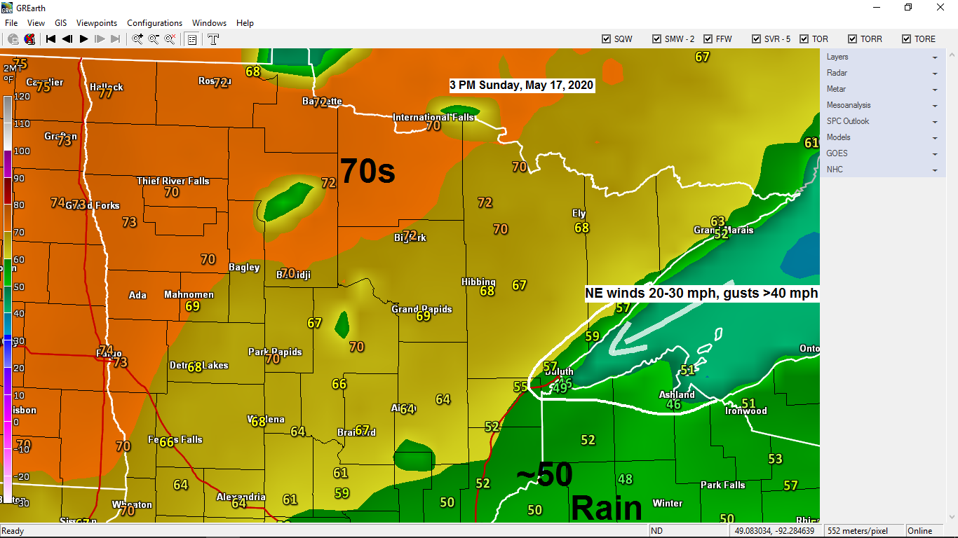 Howling winds will continue near Lake Superior the next few days with a stiff northeast wind 15 to 30 mph (gusting to around 40 mph) the wind will kick up some dust at times. Temperatures near Lake Superior won’t vary much through Wednesday with daytime highs of 45 to 55 degrees, and overnight lows around 40 degrees. Note: A cool lake breeze looks to continue past Wednesday, but not quite as windy as it will be the next few days, but still not real pleasant.