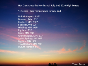 -And the high of 93 degrees on July 2nd, 2020 was the warmest temperature in Duluth since August 14th, 2015 (High of 93 degrees) and prior to that on July 18th, 2013 Duluth had a high temperature of 94 degrees!