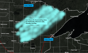 - Enough cold air looks to wrap into the backside of this system to produce a narrow band of accumulating snow somewhere across western, central or northeast Minnesota from late Wednesday afternoon into Thursday morning.