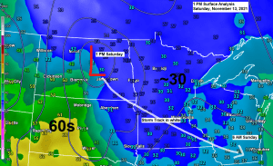 An area of low pressure (clipper) was over east-central North Dakota as of 1 PM today, this low will track quickly SE through the southern half of Minnesota tonight, reaching southern Wisconsin around daybreak on Sunday. This system will produce a swath of accumulating snow across parts of the upper Midwest through Sunday morning.