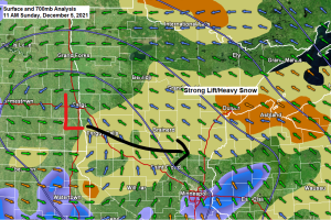 Strong forcing has been occurring ENE of the surface low this morning which has resulted in an area of heavy snow generally along and north of the Highway 2 corridor in northeast Minnesota, and also impacting the Bayfield Peninsula in northwest Wisconsin.