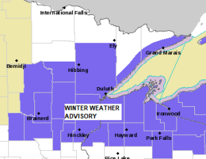 A Winter Weather Advisory is in effect from Midnight tonight to Noon Tuesday for parts of northeast, north-central and east-central Minnesota, and for all of northwest Wisconsin including the cities of Cass Lake, Walker, Pine River, Brainerd, Grand Rapids, Hill City, Aitkin, McGregor, Pine City, Hinckley, Moose Lake, Cloquet, Duluth, Hibbing, Two Harbors, Silver Bay, Grand Marais, Superior, Solon Springs, Port Wing, Washburn, Bayfield, Ashland, Hurley, Danbury, Grantsburg, Siren, Minong, Spooner, Shell Lake, Hayward and Winter.