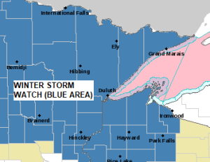A Winter Storm Watch covers the entire Northland from Sunday evening through Monday afternoon including the cities International Falls, Bigfork, Grand Rapids, Cass Lake, Walker, Pine River, Brainerd, Hill City, Aitkin, McGregor, Pine City, Hinckley, Moose Lake, Cloquet, Duluth, Hibbing, Ely, Cook, Orr, Crane Lake, Two Harbors, Isabella, Silver Bay, Grand Marais, Superior, Solon Springs, Port Wing, Bayfield, Washburn, Ashland, Hurley, Danbury, Grantsburg, Siren, Minong, Spooner, Shell Lake, Hayward and Winter.