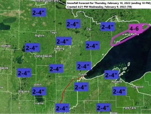 For Duluth — Snow starts around 2-3 PM Thursday, snow ends around 7-8 PM Thursday. Bursts of moderate to heavy snow are possible from around 4 PM to 7 PM Thursday.