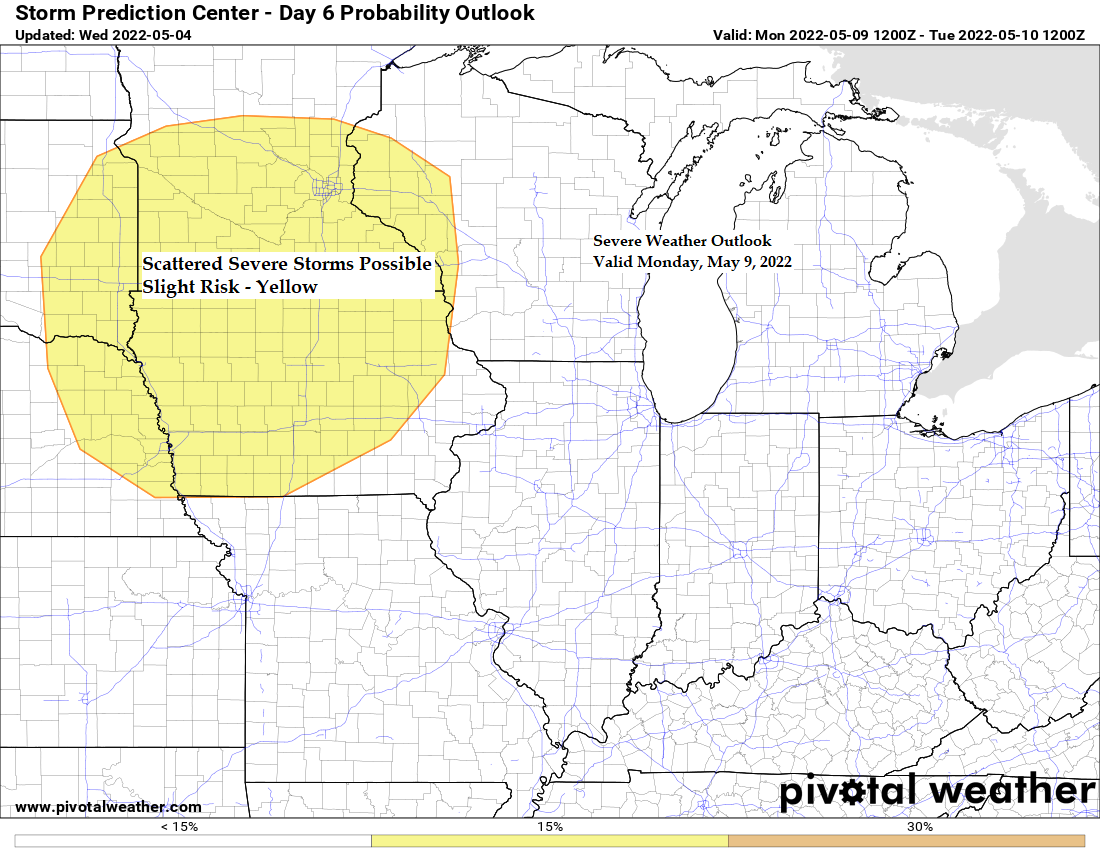 -Risk for a few severe thunderstorms from the southern half of Minnesota into western Wisconsin on Monday with additional chances for a few strong to severe storms possible in parts of the upper Midwest throughout next week.