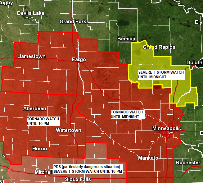 A zoomed in view of the severe weather watches in effect, the northern most watch (severe thunderstorm) includes the cities of Bena, Walker, Remer, Brainerd, Aitkin, McGregor, Hill City, Moose Lake, Sandstone, Hinckley, Pine City, Danbury, Grantsburg and Siren.