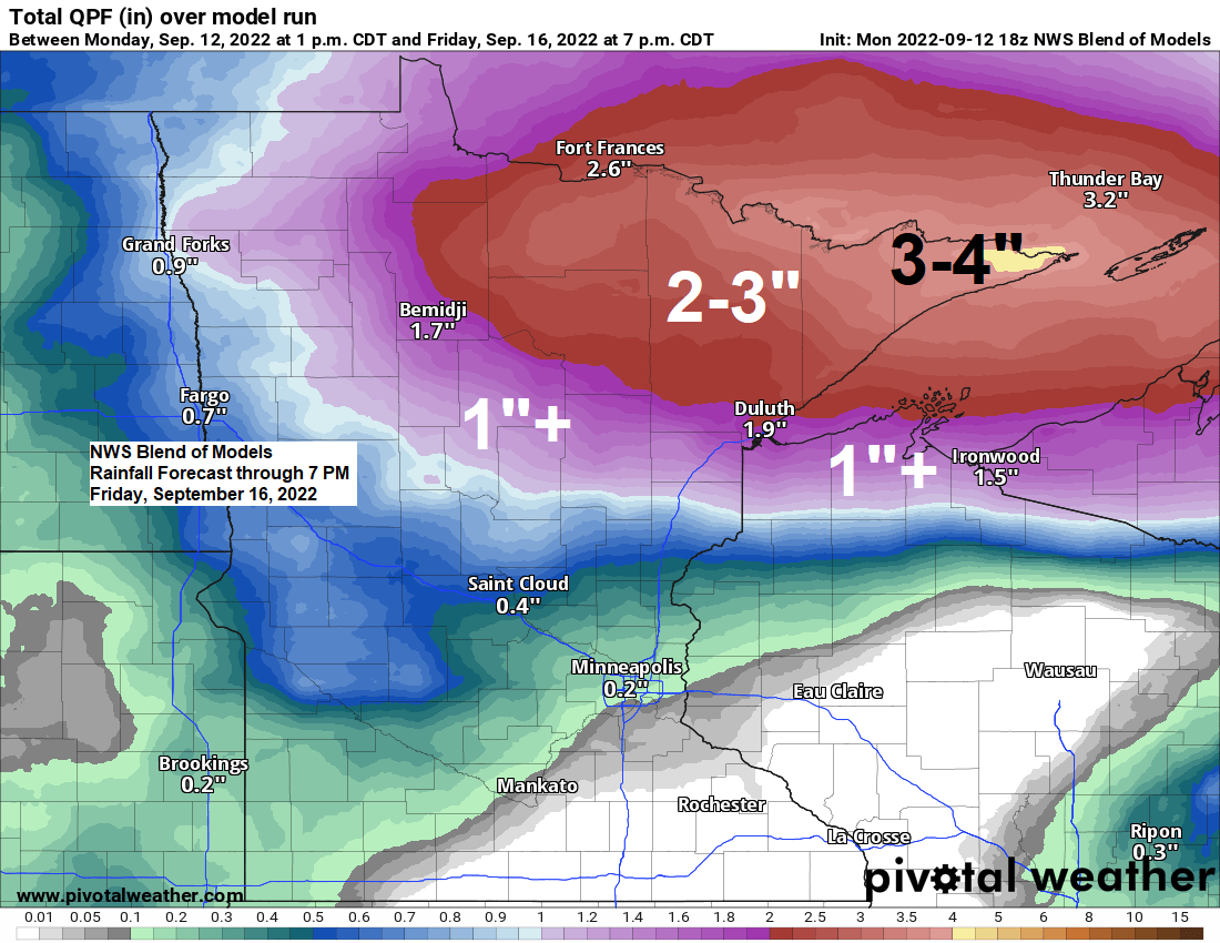 Greatest rainfall amounts are expected to be along and north of Highway 2 in northeast Minnesota where there is a chance for 2-3″+ totals.