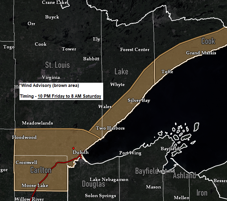 Wind gusts of 25 to 45 mph are expected in much of the Northland during the aforementioned time frame, with gusts as high as 50 mph possible especially along the North Shore of Lake Superior.