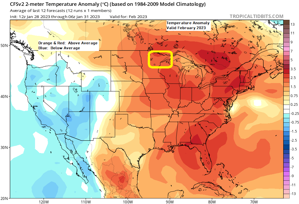 For Northeast Minnesota and Northwest Wisconsin — CFS model predicts warmer than average temperatures for February 2023.