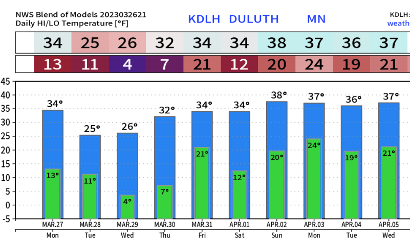 March 2023 is running about -2 to -5 degrees colder than average across the Northland, with Duluth’s temperature anomaly for March 2023 sitting at -2.8 degrees below average as of the 25th.