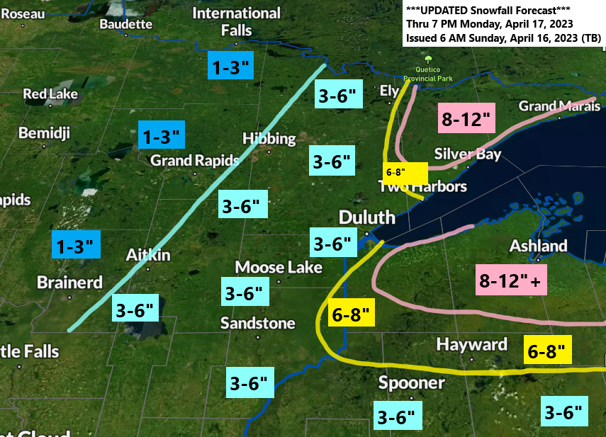 Duluth area: 3 to 6 inches of snow, although I’m leaning toward the lower end of that range, so closer to 3 inches instead of 6 inches.