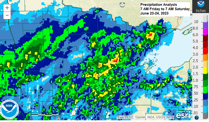 An additional 0.50″ to 1″ or more of rain is likely through 7 AM Monday in northeast Minnesota and northwest Wisconsin per the NWS Blend of Models rainfall forecast.