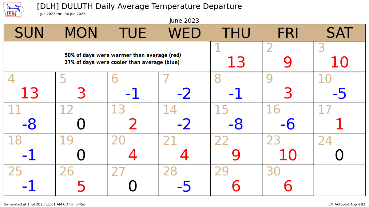 Duluth had more days which were warmer than average compared to days that were cooler than average in June 2023.