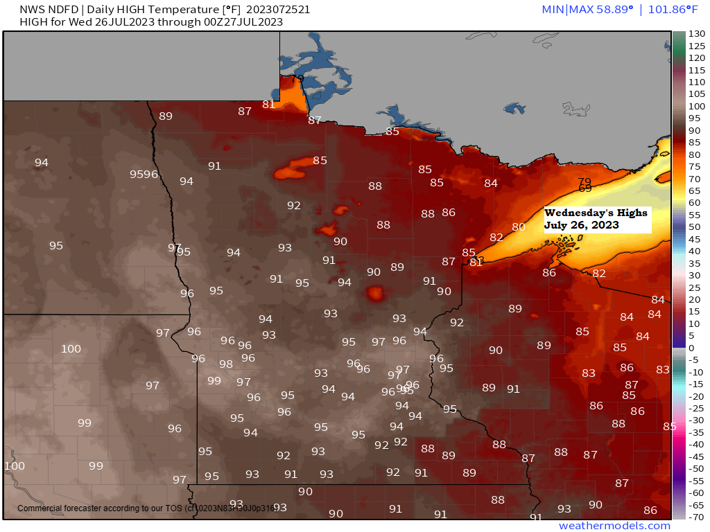Widespread 90s showing up once again this afternoon across the region, but 80s are more common across northern Minnesota and far northern Wisconsin.