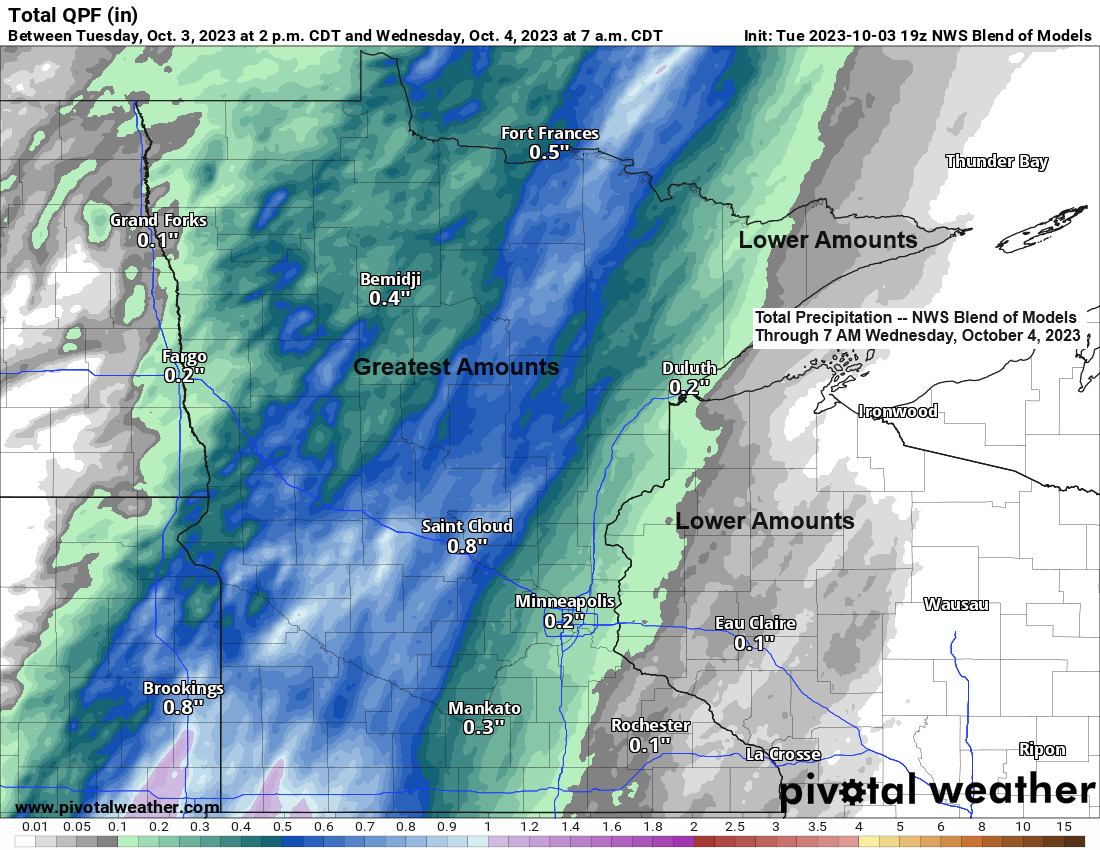 Rainfall amounts with tonight’s system look greatest across north central Minnesota with lesser amounts of rain expected in the Arrowhead, much of northwest Wisconsin and Twin Ports.