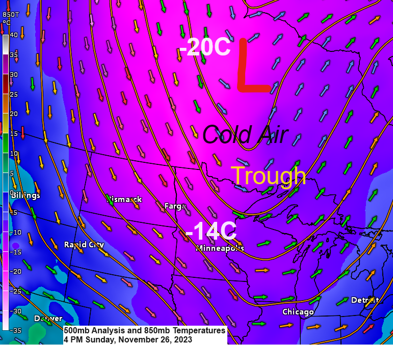 A quick shot of very cold air will drop south/east out of central Canada over the next 24 hours with 850mb temperatures across the Northland falling to around -20C on Monday, and this cold air will linger into Tuesday before we see some warmer air return mid to late week.
