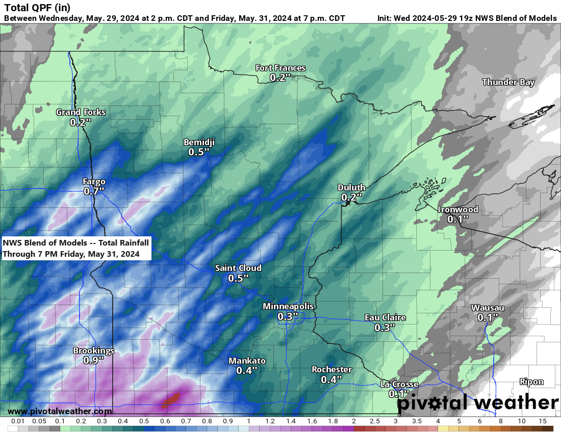 Rainfall of up to a quarter-inch is expected in northeast Minnesota and northwest Wisconsin from Thursday night into Friday morning. There may be areas with heavier rainfall, potentially exceeding half an inch.