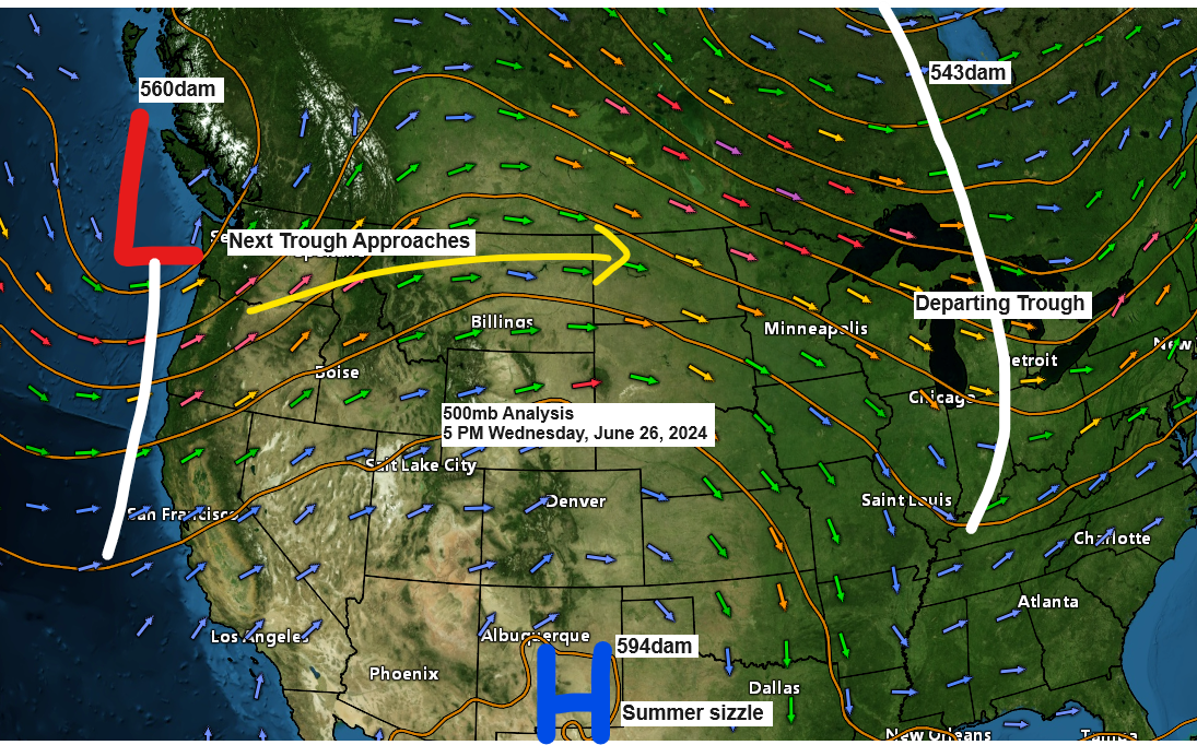 A low-pressure system, accompanied by its warm and cold fronts, will shift eastward from the northern Rockies and Plains in the coming days. This system is expected to traverse the upper Midwest by Friday, with residual effects possibly extending into Saturday.
