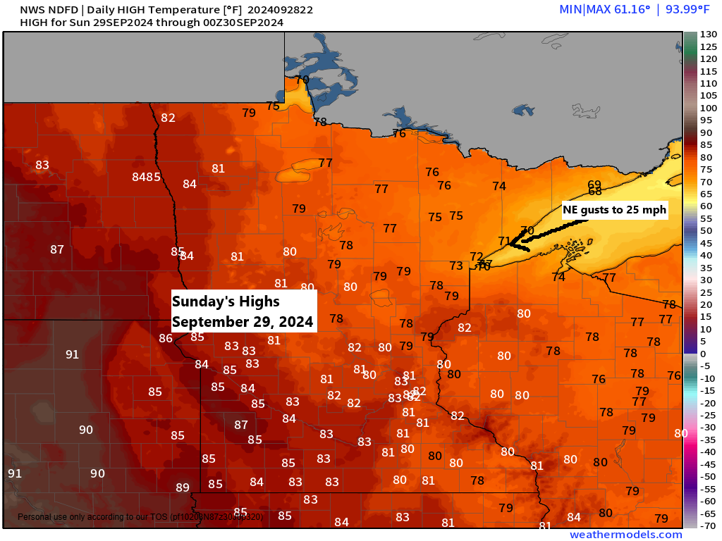 Duluth is not anticipated to experience record warmth on Sunday due to a robust northeast wind emanating from Lake Superior. Temperatures are forecasted to reach the 60s within approximately 10-15 miles of Lake Superior, while areas further inland may see highs in the 70s or approaching 80 degrees.