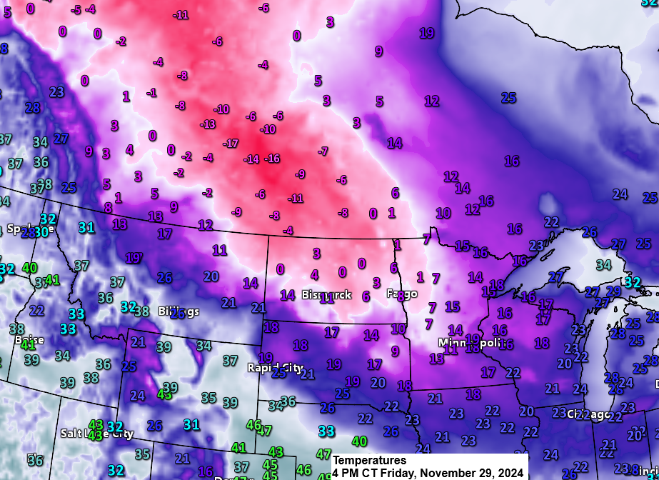 This afternoon, temperatures are plummeting to single digits and even below zero in regions of Saskatchewan and Alberta, Canada. These frigid conditions are extending southward into much of North Dakota. This cold air mass will sweep over the Northland through Saturday, although we can expect a slight moderation in temperatures by the time it reaches our area.