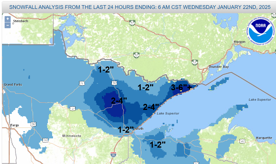 -Snowfall totals of around 1 to 2 inches have been reported in the Duluth area.