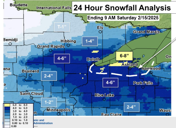 – Snow to liquid ratios greater than 30:1 were reported across parts of the Northland with this event. Typically, we see ratios around 14:1 in our area.