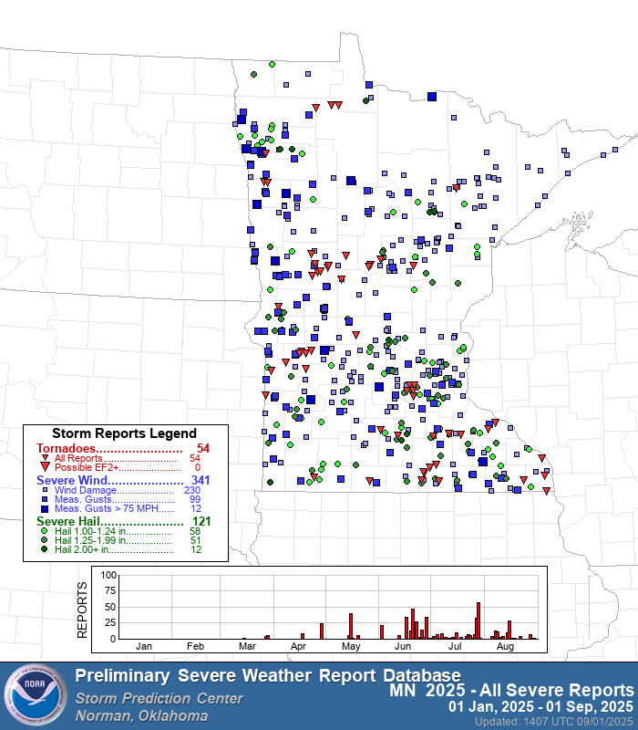 Minnesota has experienced 54 tornadoes this year, along with 341 reports of severe wind and 121 reports of severe hail.