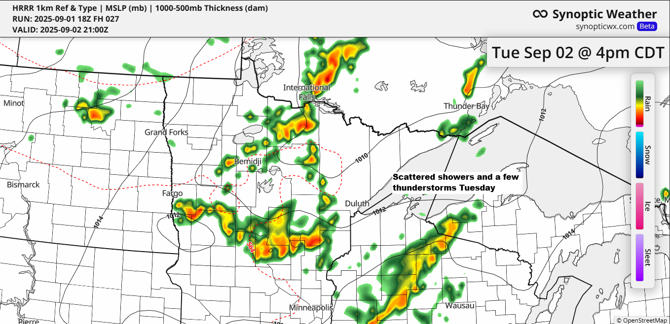 A strong cold front is set to move southeast across the Northland on Tuesday, bringing scattered showers and a few thunderstorms to northeast Minnesota and northwest Wisconsin. While severe thunderstorms aren’t expected, some storms may bring heavy downpours, wind gusts up to 40 mph, and small hail less than 1 inch in diameter.