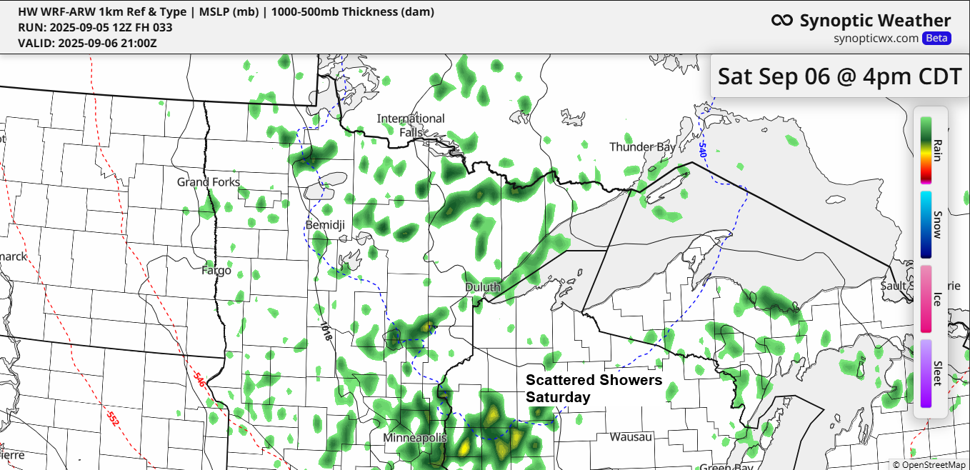 A cool pattern persists through the weekend, with a strong trough and upper low settled over Ontario and the Great Lakes, maintaining a northwest flow aloft across the Northland.