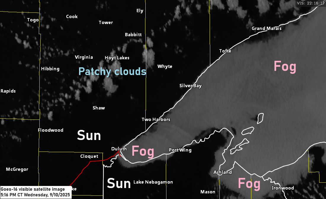 Dense fog is moving in again tonight, spreading west and south from Lake Superior. It will linger into Thursday morning before clearing by the afternoon, with another round expected to roll in Thursday night.