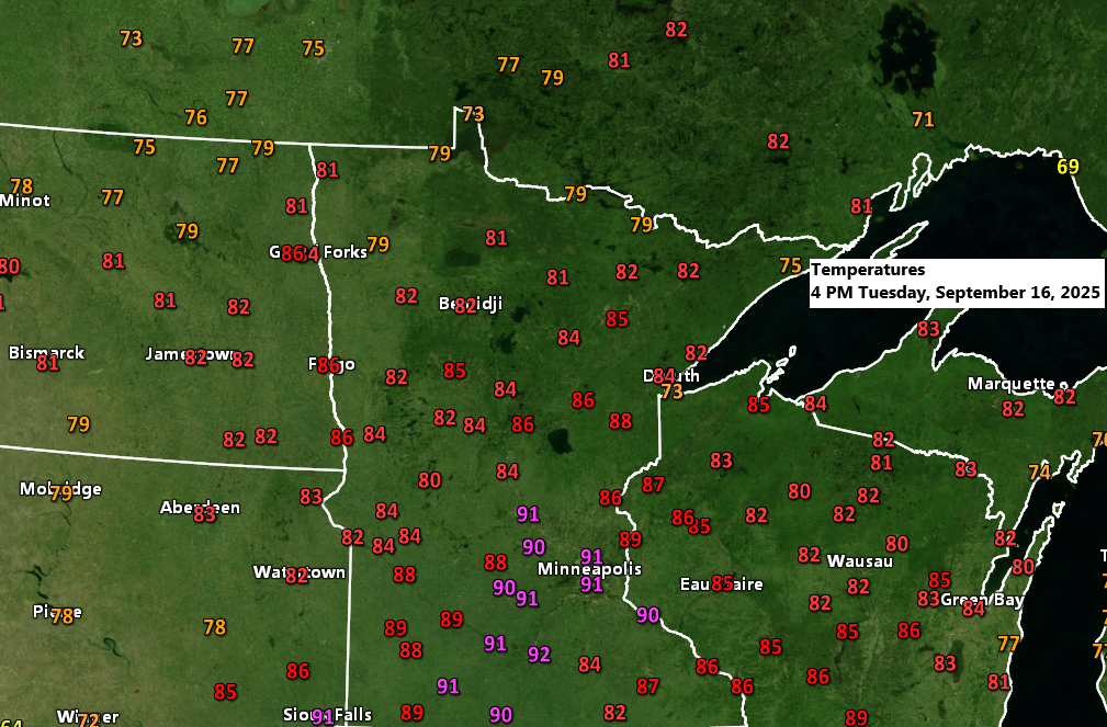 Note: Temperatures soared into the 90s across parts of central and southern Minnesota today. Check out these readings from 4 PM on Tuesday!