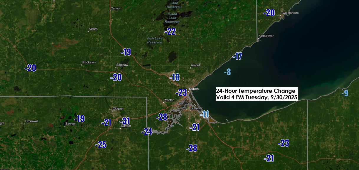 Around Lake Superior, highs dropped from the 80s on Monday to the upper 50s and lower 60s, a significant 15 to 25-degree decline compared to Monday afternoon.