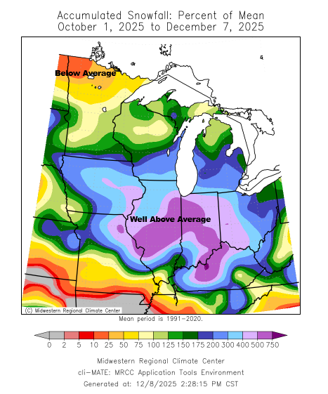 Duluth, MN has had about 85% of its usual snowfall by December 7th, running just slightly below normal, but still over 10 inches more than what we saw by this date last season.