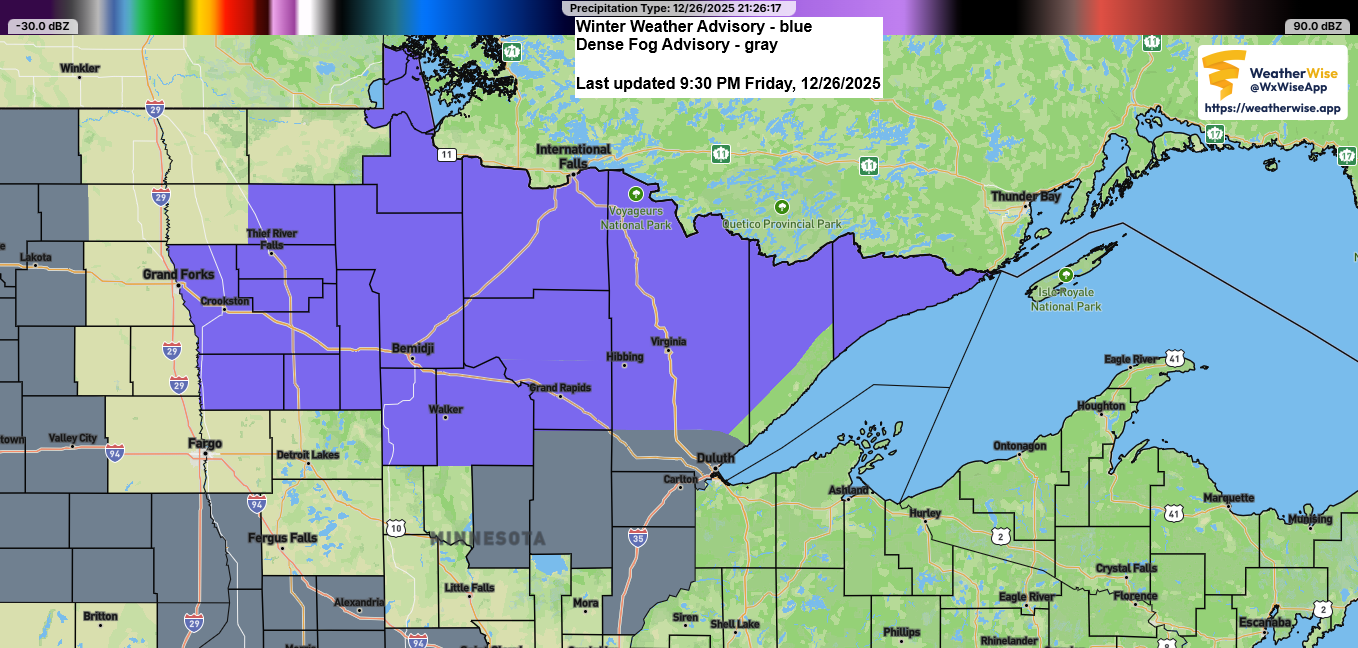 -A Winter Weather Advisory is in effect across northern Minnesota, with a light glaze of ice up to 0.05 inches possible overnight.