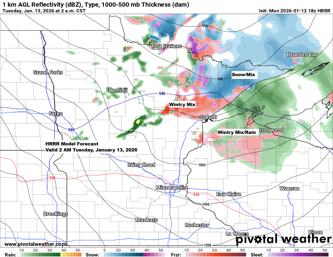 The next clipper will slide southeast across the Northland late tonight into Tuesday morning, bringing in warmer air along with a mix of snow, sleet, and some patchy freezing rain. While the precipitation should be light and short-lived, even a bit of freezing rain can make roads slick, so watch for slippery spots early Tuesday. Temperatures will climb above freezing during the day, helping to improve travel conditions.