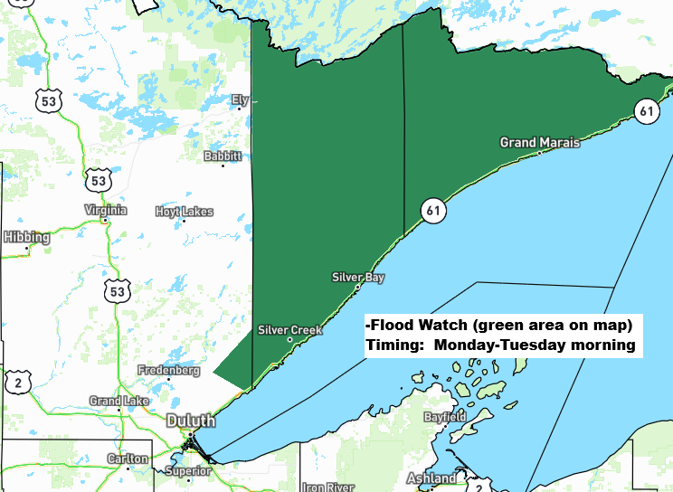 This rain on already saturated soils in the Arrowhead of Minnesota and along the North Shore of Lake Superior may lead to excessive runoff and flooding of rivers, creeks, and low-lying areas, especially in poor drainage and urban locations from Monday into Tuesday morning.